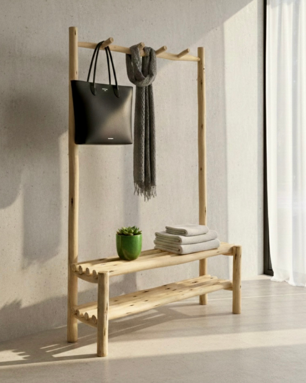 Este perchero artesanal está hecho 100% en palo de eucalipto, destacando su forma orgánica, las vetas rústicas y la nobleza de la madera cruda. Incluye un asiento tipo banco con espacio de apoyo inferior y una estructura superior con colgadores, ideal para organizar y decorar al mismo tiempo.